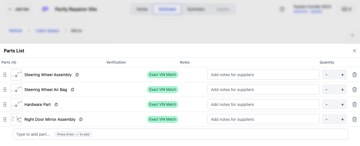 - There is also a part addition bar just below your chosen parts, here you can enter any part, even if it isn't in the Partly Catalogue to send to your supplier.